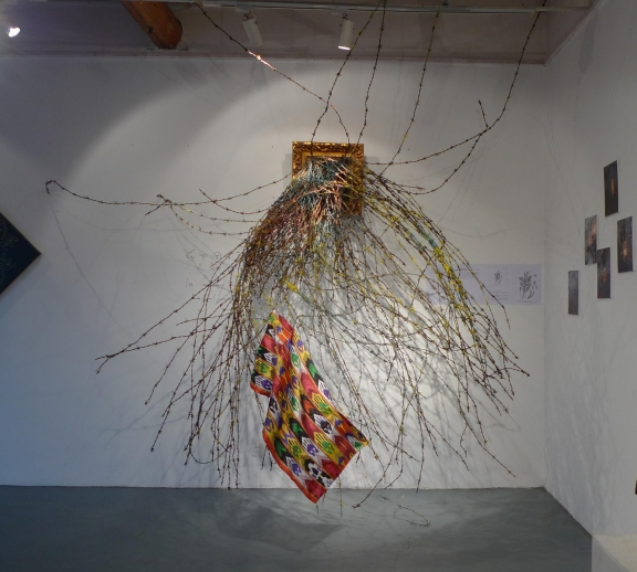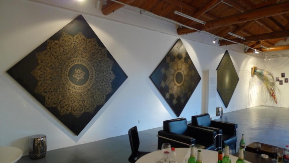 In the series paintings "Gobi Spring", Wang Ling made a systems analysis and in-depth study on the characteristics of Islamic patterns and shapes, which commonly can be seen curved in the wall of Mosques or public buildings. In his view, the pictures transmitted Islamic culture's self-enclosed, exclusive, aggressive temperament, in history, when this kind of complexity met out-strangers, it often exhibited with violent conflict and discomfort.