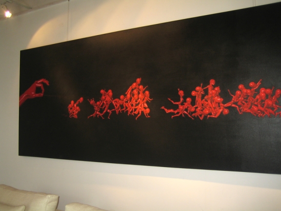 This time Soemo Fine Arts choose only two Artists for this exhibition, both born north of the Yangtze, 4 years apart in the late 60th and early 70th, found their success rather late in comparison with the young shooting stars of the Chinese contemporary Art Scene. Both Artist main themes are the powerless in the new Chinese Society, the ones who are living on the edge of Society, pictured as small red men by Shi Li Feng or prostitutes who are in a vicious circle, by Zhang Haiying.